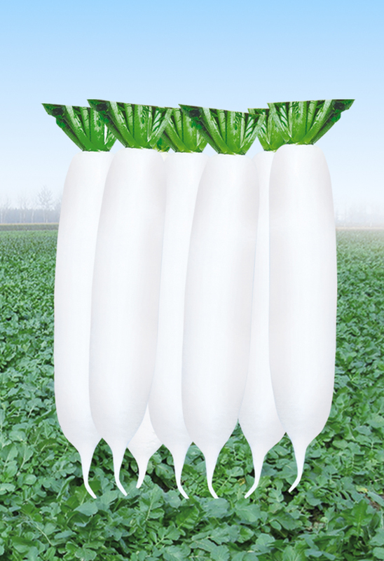 45天左右,抗热,高产,新一代白萝卜品种。绿色板叶,肉质根长圆柱形,根长20~25cm,茎粗5~7cm,白皮白肉,肉质细腻,不易糠心,适应性广。