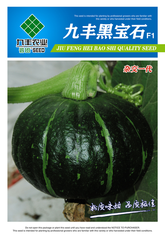 最新培育的杂交一代南瓜中早熟新品种,果实扁圆形,果皮墨绿色,老熟果皮显黑而鲜亮,果肉厚,橙黄色,口感香甜,肉质细腻,商品性极佳。易座果,单株可结2-3个老瓜,单果重1.5-2.0公斤,产量高,一般亩产2000-2500公斤,耐贮运,抗病性强。
